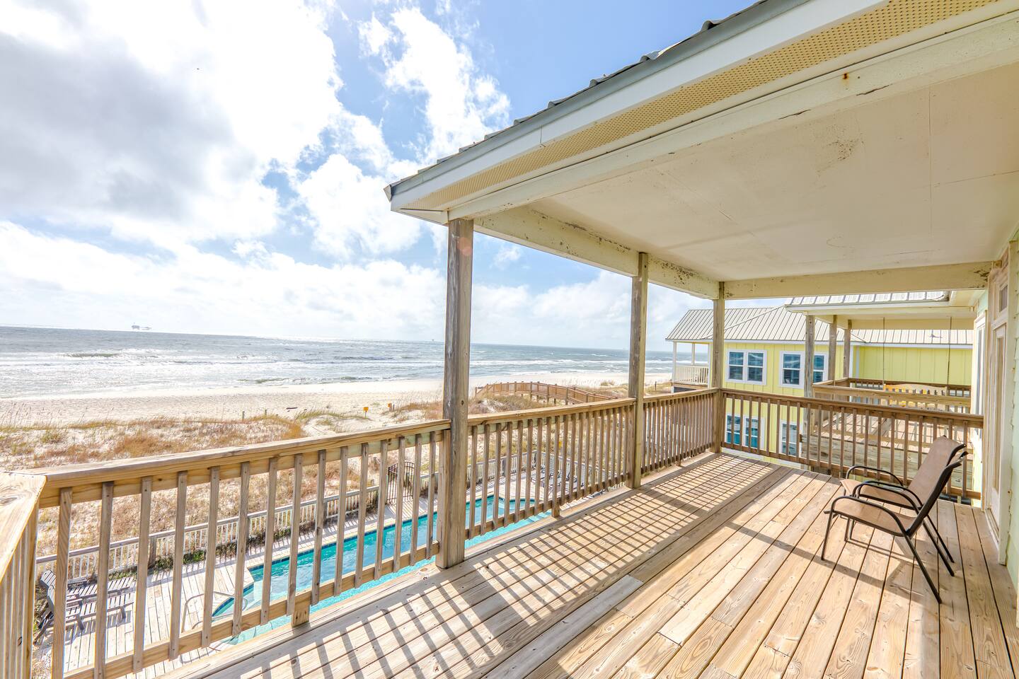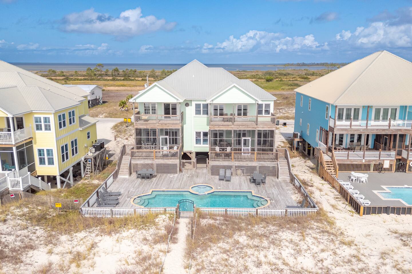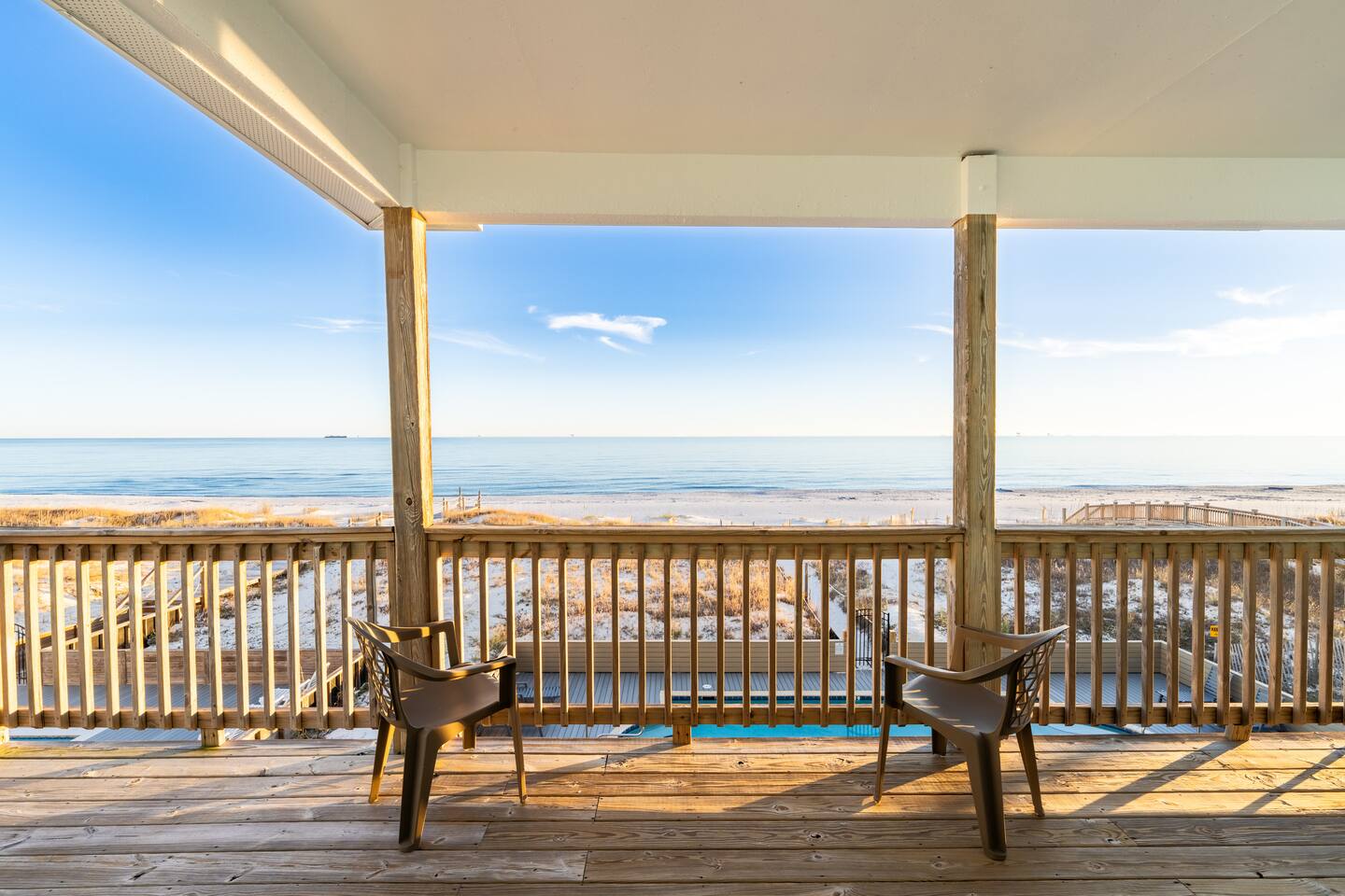 This calming retreat, located on the Gulf beach in Fort Morgan, Alabama, features a 5 bedroom (+ sleeping loft), 4 bathroom home that sleeps 20. This property is the East side unit of a duplex ("Cair Paravel"), that includes a very large private pool shared only with the other side of the duplex, and uniquely offers views of both the Gulf and the Mobile Bay. Cair Paravel East is a two level home with an open floor plan, fully equipped kitchen, spacious bedrooms, screened in porch and pool. The first level features the main living space, with a large kitchen, dining room, living room and access to the screened porch. The first level also includes a Gulf-view King suite with a full bathroom and opens onto the porch, a second King bedroom and another full bathroom. The living room has a new flat screen tv, and each bedroom has its own Roku tv. The second level includes a sleeping loft with a full-size daybed and twin trundle, a Bay-view bunk room with two sets of bunk beds, a jack-and-jill bathroom, a spacious Gulf-view bedroom with two queen beds, and the Master King suite. The beautifully renovated Master Suite is enormous, featuring a King bed, desk and tv, and a completely new bathroom with a tile walk-in shower and granite countertops. The views from the Master Suite are unbeatable. Take a peak at the Mobile Bay from the bathroom, and enjoy the amazing Gulf views from the bedroom or from the covered porch attached to the Master suite and the 2 Queen Bedroom. Convenience is key with the pool and the beach just steps from the house. The pool deck is large enough to serve meals, play games and soak up the sun. Swim laps or just lounge in the huge pool while the little ones enjoy the small wading pool attached to it. A short boardwalk leads directly to the open, white sand where you can set up an umbrella or tent and chairs, kayak, fish, search for sea shells, or just relax on the beach. High speed wireless internet (Wi-Fi) throughout the house. We would love for you experience the peaceful paradise of Fort Morgan Beach. If you would like to rent out both sides of this duplex please contact us and we would be happy to help you find weeks where both sides are available together.