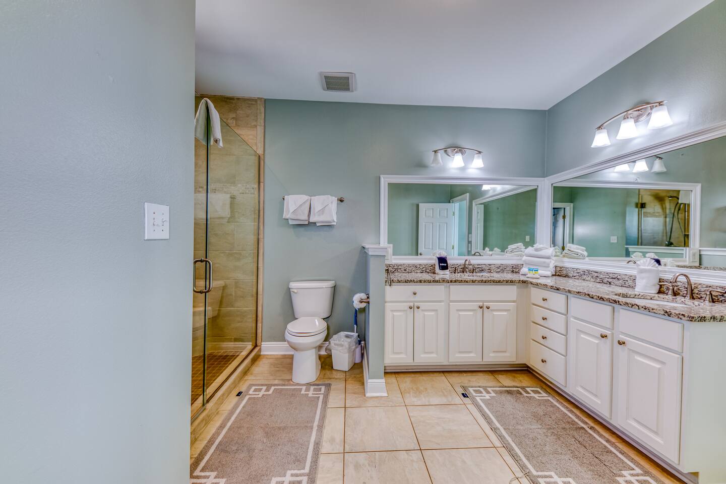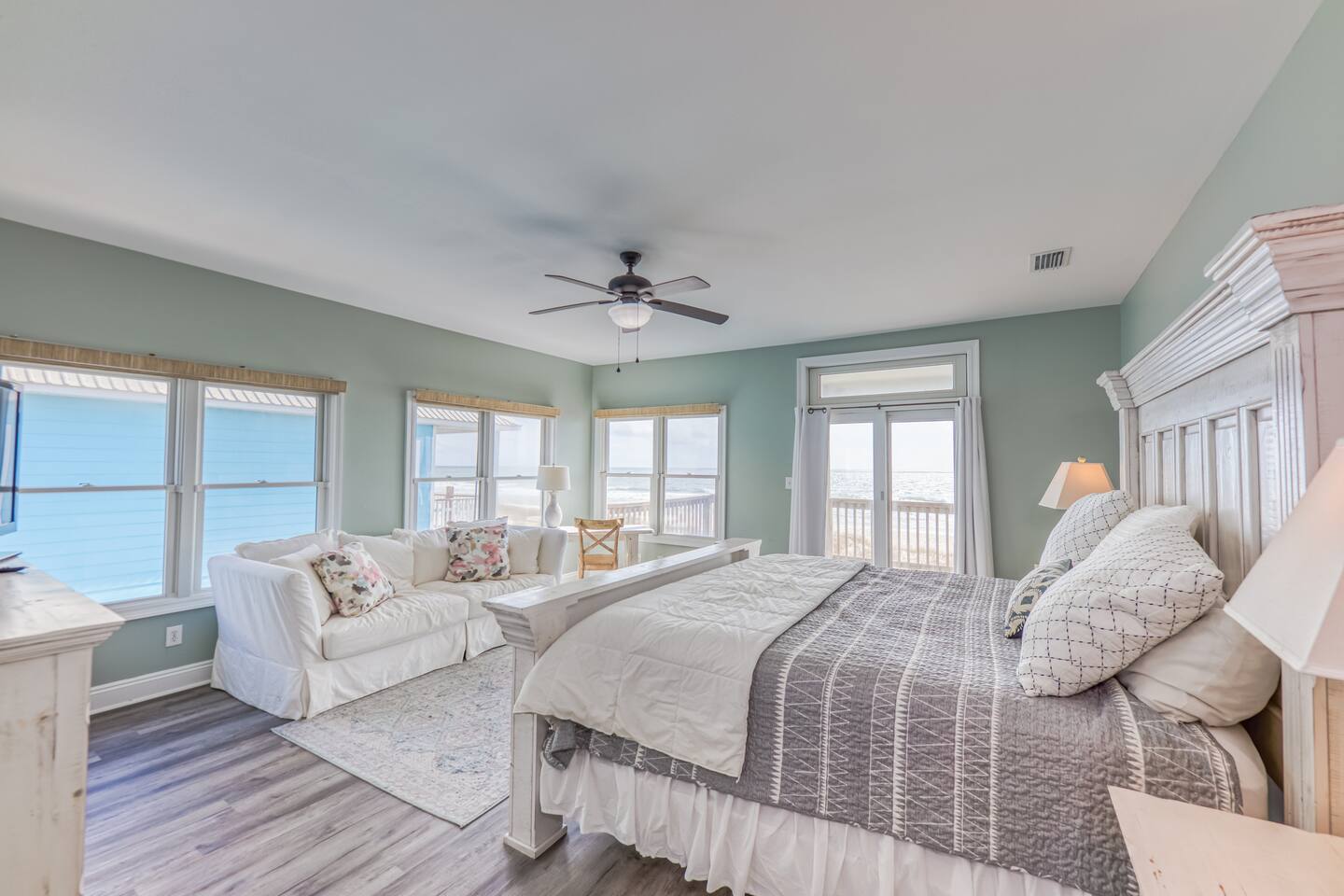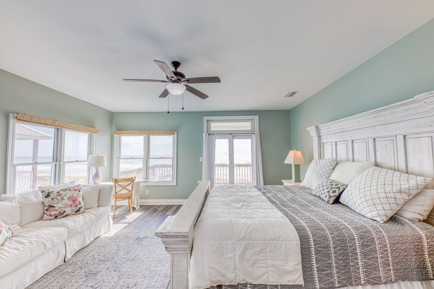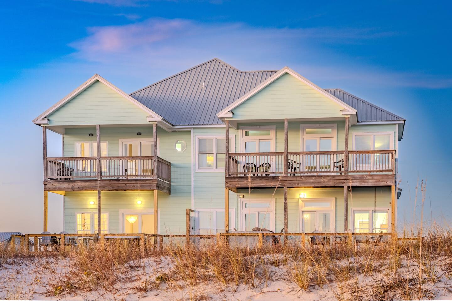 This calming retreat, located on the Gulf beach in Fort Morgan, Alabama, features a 5 bedroom (+ sleeping loft), 4 bathroom home that sleeps 20. This property is the East side unit of a duplex ("Cair Paravel"), that includes a very large private pool shared only with the other side of the duplex, and uniquely offers views of both the Gulf and the Mobile Bay. Cair Paravel East is a two level home with an open floor plan, fully equipped kitchen, spacious bedrooms, screened in porch and pool. The first level features the main living space, with a large kitchen, dining room, living room and access to the screened porch. The first level also includes a Gulf-view King suite with a full bathroom and opens onto the porch, a second King bedroom and another full bathroom. The living room has a new flat screen tv, and each bedroom has its own Roku tv. The second level includes a sleeping loft with a full-size daybed and twin trundle, a Bay-view bunk room with two sets of bunk beds, a jack-and-jill bathroom, a spacious Gulf-view bedroom with two queen beds, and the Master King suite. The beautifully renovated Master Suite is enormous, featuring a King bed, desk and tv, and a completely new bathroom with a tile walk-in shower and granite countertops. The views from the Master Suite are unbeatable. Take a peak at the Mobile Bay from the bathroom, and enjoy the amazing Gulf views from the bedroom or from the covered porch attached to the Master suite and the 2 Queen Bedroom. Convenience is key with the pool and the beach just steps from the house. The pool deck is large enough to serve meals, play games and soak up the sun. Swim laps or just lounge in the huge pool while the little ones enjoy the small wading pool attached to it. A short boardwalk leads directly to the open, white sand where you can set up an umbrella or tent and chairs, kayak, fish, search for sea shells, or just relax on the beach. High speed wireless internet (Wi-Fi) throughout the house. We would love for you experience the peaceful paradise of Fort Morgan Beach. If you would like to rent out both sides of this duplex please contact us and we would be happy to help you find weeks where both sides are available together.